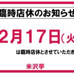 臨時休業のお知らせ 2026/2/11 日頃より米沢亭グループをご愛顧いただきありがとうございます。 下記日程にて休業させていただきます。 2/17 臨時休業 米沢亭本店 / 米沢亭渋川店 / 米沢亭はなれ 2/17~18 定休日 米沢亭伊勢崎店 お客様にはご迷惑をおかけいたしますが今後とも米沢亭グループをよろしくお願いいたします。 ...